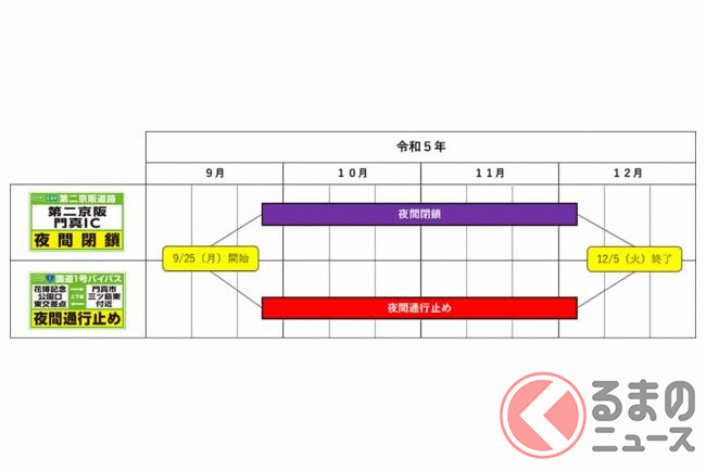 第二京阪門真ICと、並行する国道1号バイパス(大阪北道路)で、2023年の9月から12月にかけて夜間の閉鎖や通行止めが計画されています。