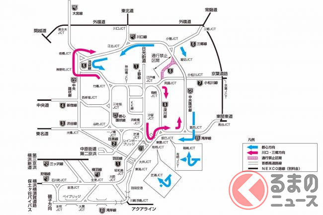 ただし大会実行委員会や警視庁は、通行禁止区域の周辺道路は混雑が予想されることからクルマの利用を自粛するとともに、通過する際はさらに外側を走る環七通りや新大橋通りなどへの迂回を呼び掛けています。