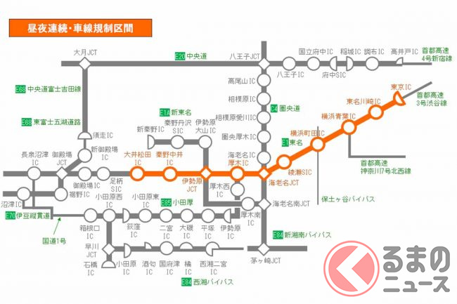平日未明に「渋滞25km」!? 東名「東京IC~大井松田IC」で車線減やIC閉鎖 10月から集中工事
