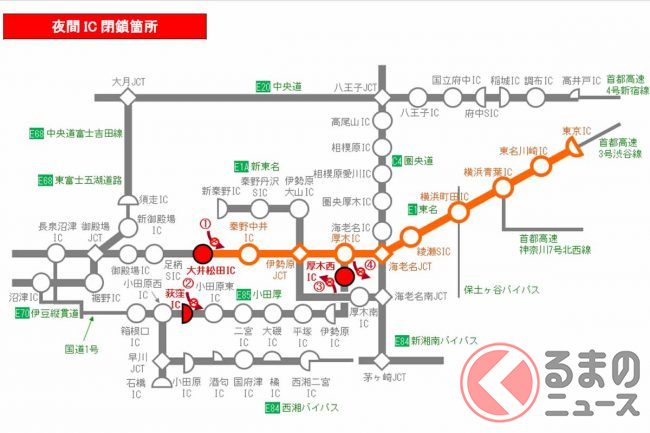 対象となるのは、東名の大井松田IC上り入口、小田厚の荻窪IC上り入口、厚木西IC上り出口・下り出口です。閉鎖日はICによって異なります。