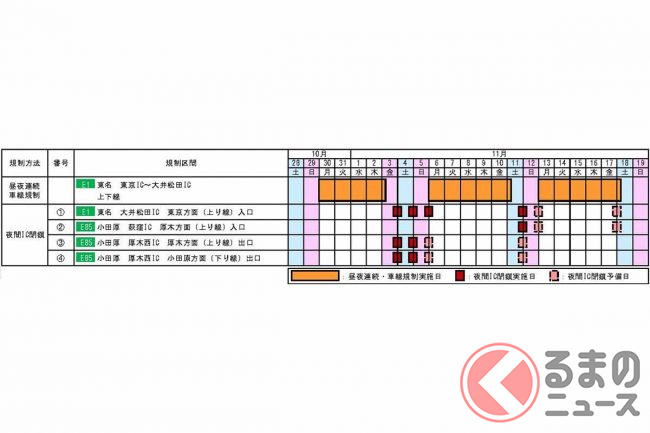 工事は10月30日0時から11月18日6時にかけて、東名と小田原厚木道路(小田厚)で実施されます。
