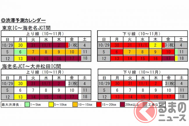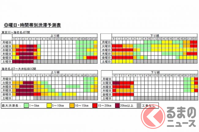 これに伴い、東京IC~大井松田IC間の上下線では、昼夜にまたがって車線規制を実施。区間や時間帯によって走れる車線数は異なりますが、2車線減が計画されている夜間を中心に、最大約25kmの激しい渋滞が予想されています。