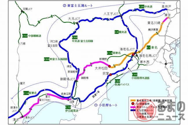 NEXCO中日本は、集中工事の期間中、小田厚、圏央道、中央道、東富士五湖道路などへの迂回を呼びます。
