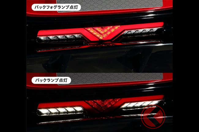 「ジュエルLEDバックフォグランプREVO」は、58個の高輝度LED(バックランプに20個、バックフォグに38個)とLEDライトバーで構成されている製品です。LEDはインナーレンズを採用することにより、消灯時でもLEDチップが見えないスタイリッシュな設計で、高輝度LEDを採用することにより、後続車からの視認性が向上、安全性も高まるとしています。