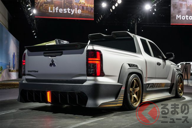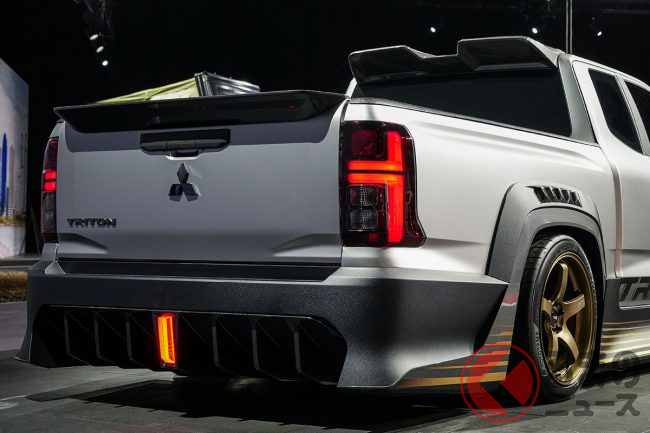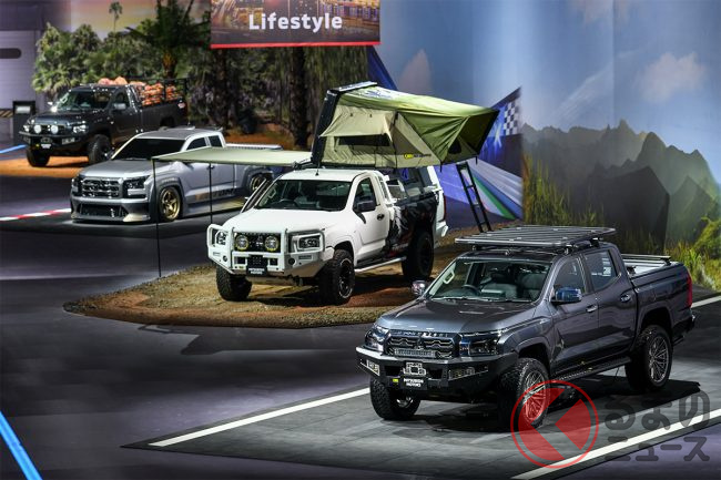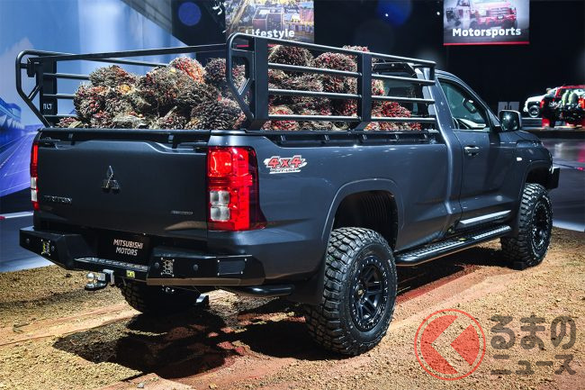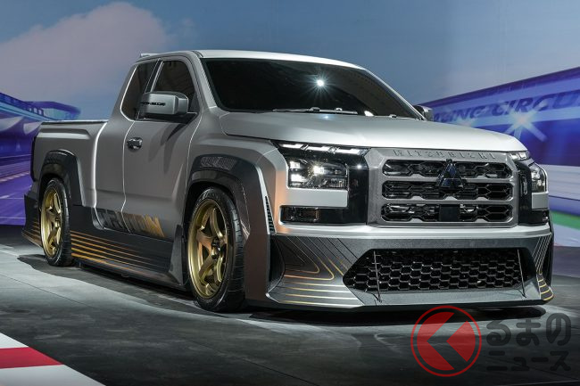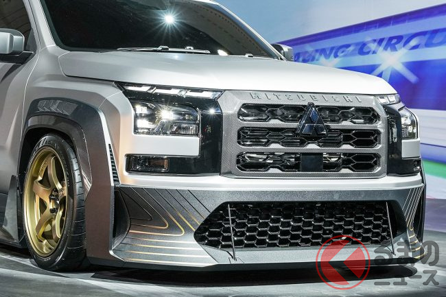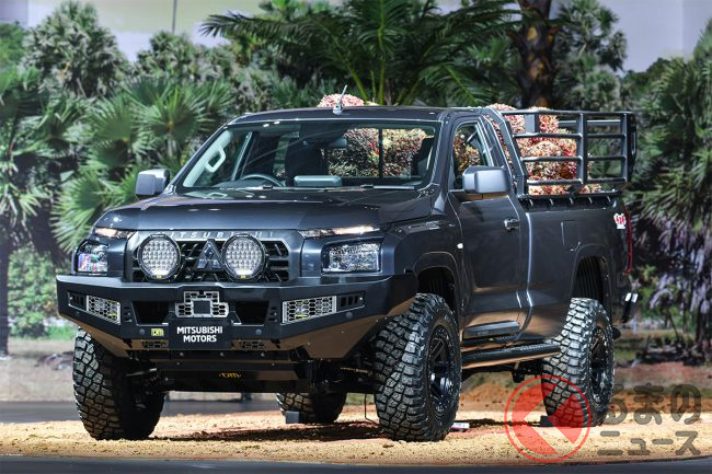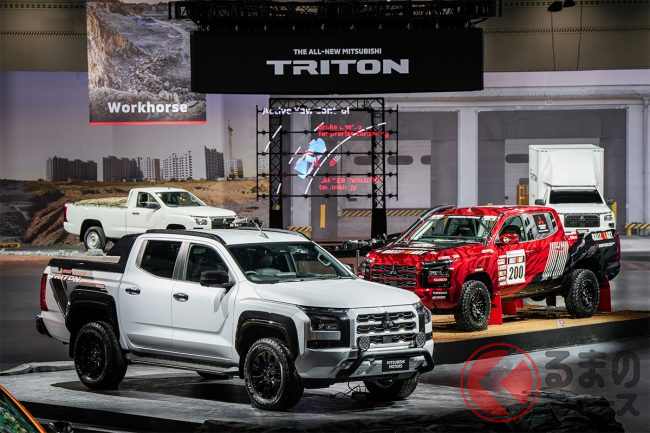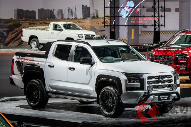 三菱が「エボリューション」な新型「巨大マシン」実車展示! 極厚ゴツマスク&シャコタンのド迫力「トライトン」!? タイで初公開