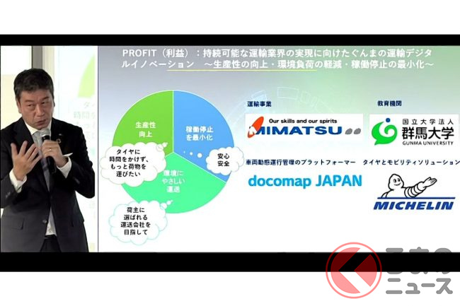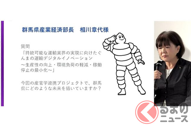 会見ではまず、須藤氏が「自動車産業の大変革期、物流業界の2024年問題、そしてものづくりの在り方、業界自体が変化する中、私たちはこの地にミシュランの知恵と経験を結集し、群馬からイノベーションを起こす。本日はミシュランが『群馬から世界へ』こぎだすための、船とその航路をご覧いただきたい」とあいさつ。