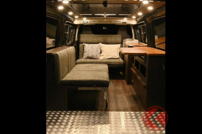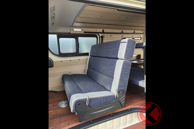 暑さや寒さを緩和する断熱施工や軽量なベッドマットなど、ホビクルオーバーランダーIVの長所を活かしつつ、ベッドやシートには、広島県福山市に本社を置くカイハラ産業の製造した「アカミミ」と呼ばれるデニム生地を使用しました。