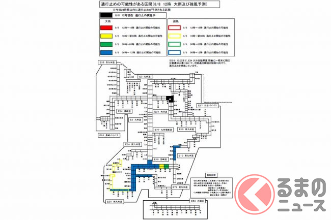 今後24時間以内に通行止めが予測される区間は次のとおりです(8日正午現在)。