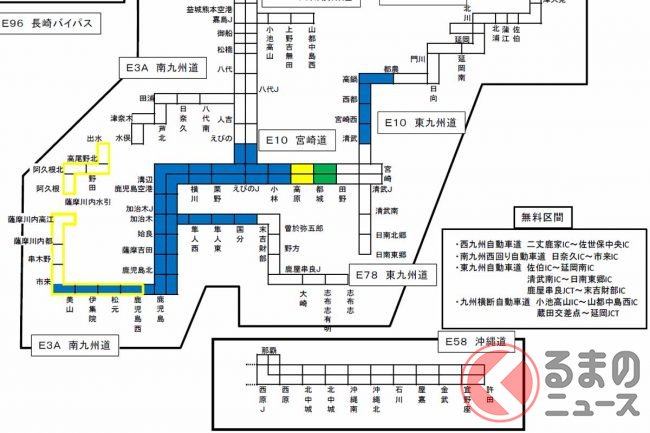 ・南九州道:出水IC~阿久根IC、薩摩川内水引IC~鹿児島IC