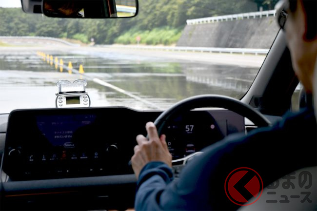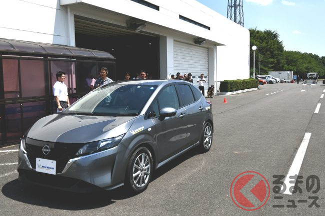 まずは、「e・PRIMACY」を装着したサクラを、ウエットハンドリング路で乗りました。「e・PRIMACY」は、転がり抵抗性能「AAA」を21サイズで達成(7サイズ取得中)するとともに、静粛性や性能維持力も高められています。同じウエット性能が「C」で、転がり抵抗が「A」のミシュランの低燃費タイヤである「ENERGY SAVER 4」と乗り比べることもできました。