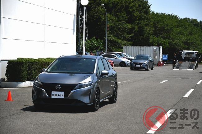 また、ノートe-POWERに「AA」の「e・PRIMACY」と「A」の「ENERGY SAVER 4」を装着して、転がり抵抗の違いによりどのような差があるのかのデモを見学しました。車両をキャリアカーに乗せて荷台を斜めにしてどこまで惰走するかを比べると、思った以上に差がつくことに驚きました。「AA」と「A」の差は小さくありません。