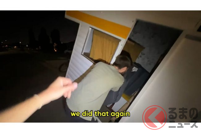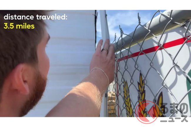 その後運転手を交代して走行を続けますが、初日で進めたのはわずか7マイル。仕方なく近くの道路で夜を明かそうとしますが、今度は荷台が崩れて傾く事態に。何とか車体を立て直しますが、今度は不審に思った警察官が様子を伺いに来ます。これ以上の災難を避けるため、やむなく夜中に坂を上って、近くのウォルマートまで移動します。