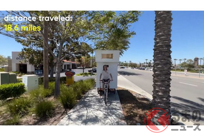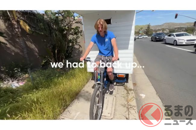 今回の動画では、2人のドライバーが交代でペダルを漕ぎ、2日間で100マイル(約160km)の走破を目指します。1人が自転車を漕ぐとき、もう1人は基本的に荷台で待機。ただ坂を上るときは、もう片方のドライバーも荷台から降りて後ろから押してあげます。