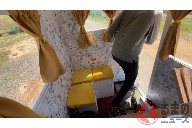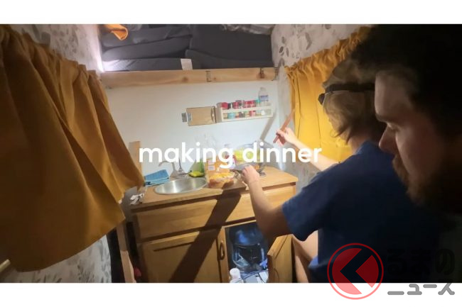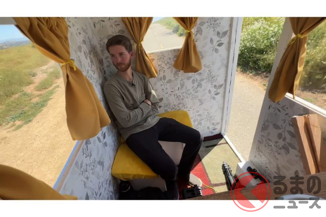 このキャンピング自転車は、もともと日本人が作っていたのを見つけて、同じように改造を施したそうです。人力で稼働するとはいえ、荷台の設備はなかなかに豪華。折りたたみ式のベッドや、シンク、水道、それにキッチンなどを完備している上、ルーフには太陽光パネルも付いています。ただし車内の振動はかなり激しめです。