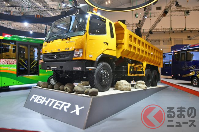 さらにKTB社は、中型トラック「ファイターX」のオフロード向けモデルも出展。資源が豊富なインドネシアでは、山林や採石場での資源収集と運搬が中型トラックの需要につながっており、2023年3月から販売しているオフロード仕様「ファイターX」は、未舗装路や不整地での利用に合わせ、通常モデルよりも最低地上高を高く設定し、汚れが目立ちにくいマットブラックのフロントグリルや標準装備のラジエーターガードなど、さまざまな路面条件に対応する特徴を持っています。