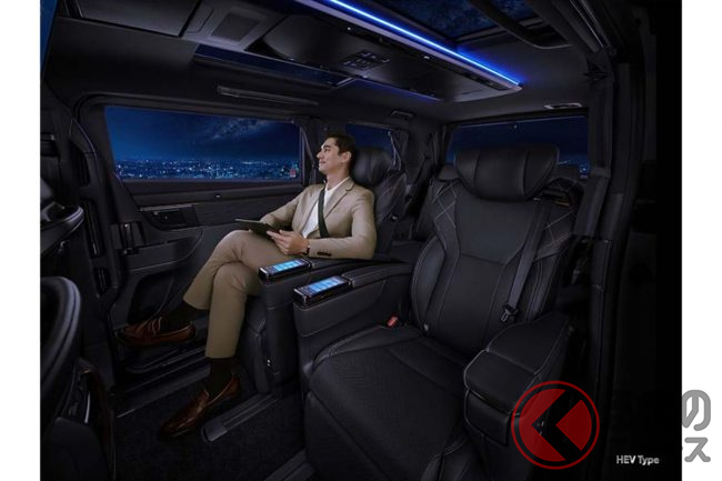 インテリアは、高さがあるセンターコンソールや、ラウンドした形状のインパネのトリムにより、包まれ感のある前席となるほか、2列目シートはプライベートジェットのような「おもてなし空間」が実現されています。