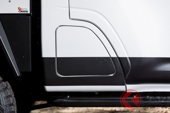 一方、切断部より前側で目をひくのは、まずグリルガードとバンパーを一体化したブルバーです。そこからサイドへと囲むようにフェンダーレールが装着され、さらにドア下に取り付けられたサイドステップは、ホイールベースの延長に伴って設計された、このピックアップトラック専用パーツとなっています。