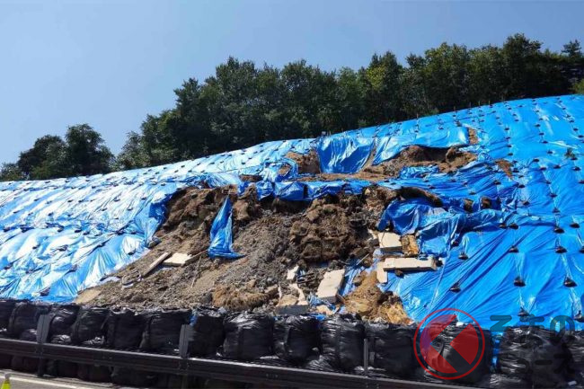 東北中央道の霊山IC~伊達中央IC間は、斜面に変状が生じたため2023年8月3日から通行止めが続いていますが、現場では応急復旧工事が始まりました。