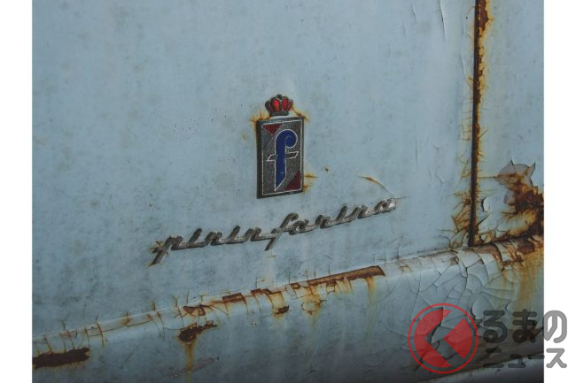長い時間が経過しているだけあり、サビだらけでクルマの状態はさほど良さそうには見えません。しかし、この水色のカラーリングは工場出荷時から変化していないようです。また、ピニン・ファリーナのバッジが残っている点などもその貴重性も高めています。