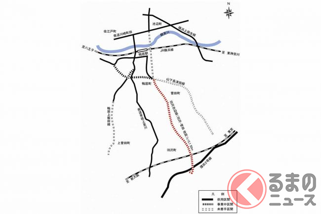 現在、整備事業が進んでいるのは、環状2号線から鴨居駅手前の山下長津田線(緑区鴨居町)に至る延長3150mの「羽沢・菅田地区」です。