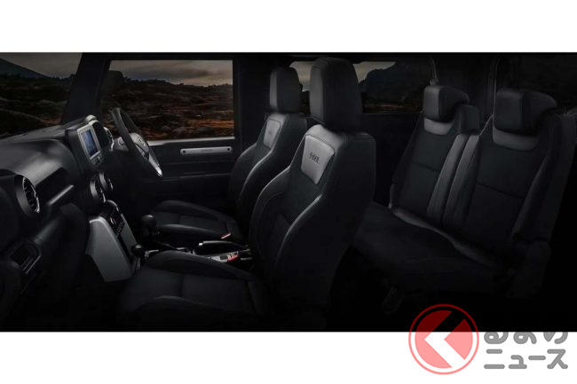 インテリアもオフロード走行を念頭に置いて作られています。全体的には構成要素の少ないスッキリとしたデザインで、中央に配されるシフトレバーは現代には珍しい操縦桿のように巨大なシフトレバーです。