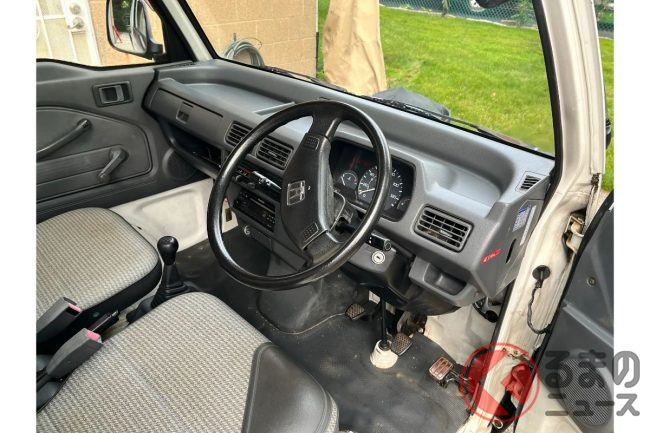 エクステリアは28年経過している点を考慮するとキレイな状態を維持しており、ボンネット(MRのためエンジンは荷台の下に存在)の凹みやワイパー下部のサビ、荷台左のいわゆるアオリ部に付着した黒い塗装を除けば、大きな傷などは見当たりません。