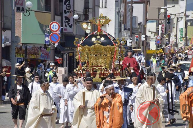 新庄まつりは江戸時代中期の1756(宝暦6)年、藩主だった戸沢まさのぶが五穀豊穣を祈願するために始めた「新祭」が起源といわれており、神輿渡御(みこしとぎょ)行列や街を練り歩く豪華絢爛な山車(やたい)が大きな見所です。