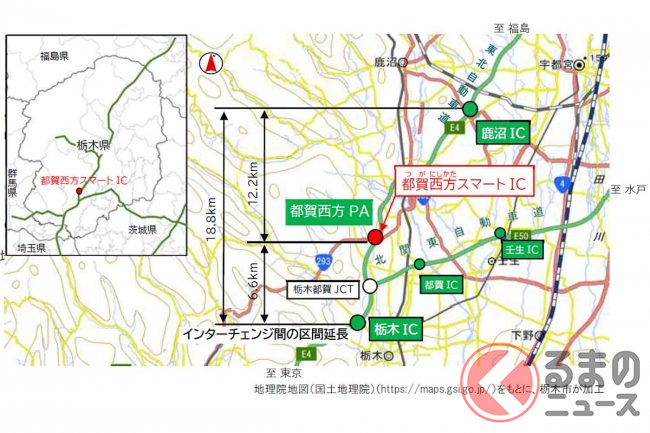 東北道の栃木IC~鹿沼IC間に、都賀西方スマートICが新たに開通します。