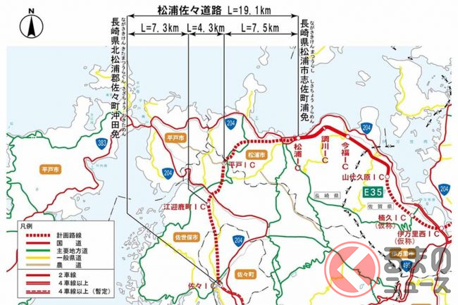 松浦佐々道路は、長崎県の松浦市(西九州道の松浦IC)と佐々町(同・佐々IC)を結ぶ延長19.1kmの高規格幹線道路です。2014年度に事業化され、自動車専用道路として幅員12.0m、2車線(片側1車線)、設計速度80km/hで整備が進められています。