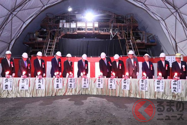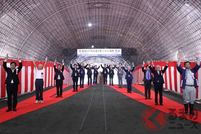 長崎河川国道事務所によると、2日に開かれた貫通式には、国会議員・行政関係者・施工者・地元住民ら約80人が出席し、貫通発破、貫通点での通り初めの儀、鏡開きで貫通を祝ったといいます。