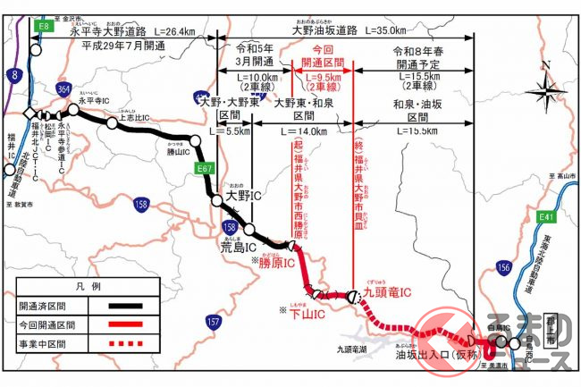 大野油坂道路の勝原IC~九頭竜IC間が、2023年10月28日に開通します。この区間は将来、中部縦貫道の一部に組み込まれます。