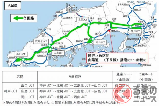 山陽道と中国道が並行する神戸JCT~山口JCT間の場合、山陽道経由の所要時間は約4時間40分ですが、迂回ルートとなる中国道経由は約5時間40分です。
