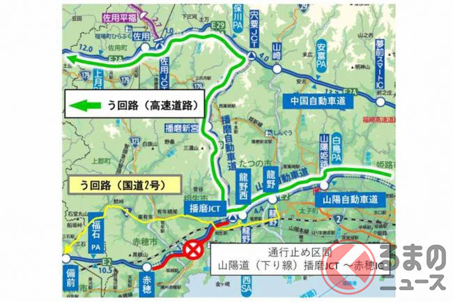 NEXCO西日本は2023年9月11日、通行止めが続く山陽道の播磨JCT~赤穂IC間のうち、上り線(神戸方面)は11日夜に通行止めを解除すると発表しました。
