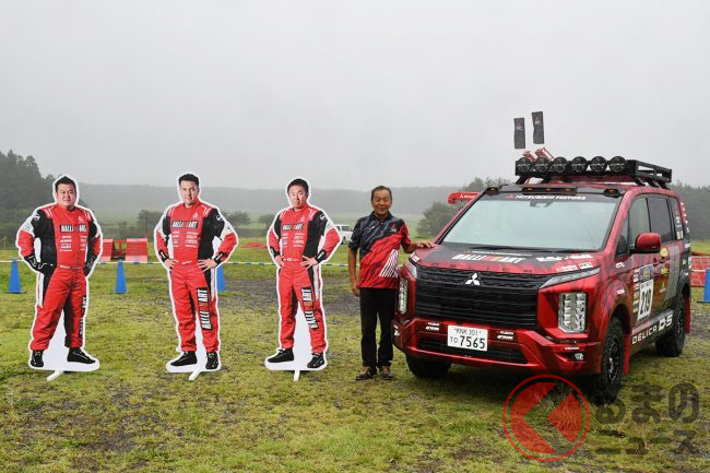 登坂キット同乗体験会のブースでは、先日新型トライトンが3位に入賞したアジアクロスカントリー2023の総監督の増岡浩氏の姿も。先日のラリーの様子や参戦した3台全て完走を果たした新型トライトンの戦闘力、モータースポーツの活動を通じての三菱自動車内での技術伝承の話など、ラリー車の活躍を支えるため現地で活躍した、溶岩をイメージした特別カラーリングのデリカD:5サポートカーと一緒に報告していました。