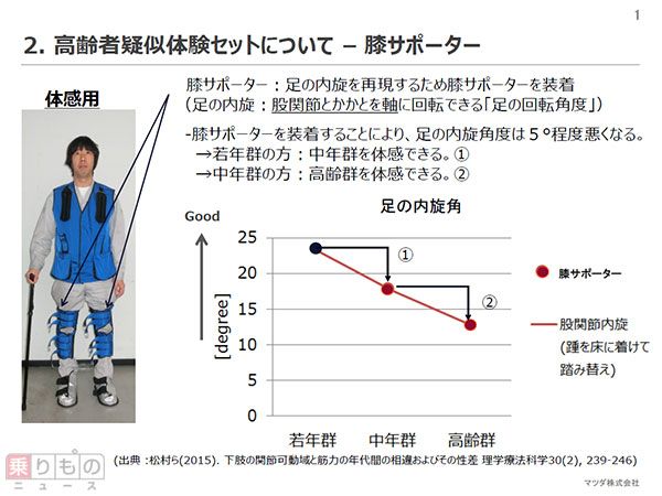 さらに、同取材会のメニューのひとつとして、高齢者の体の状態を身をもって経験してみようというものが用意されていました。おもりの入ったベスト、歩きにくいサンダル、足首まわりやひざ関節の自由が著しく制限されるサポーターなどを身に着けると、確かに杖なしでは歩くこともままならなくなります。加えて視界を制限するメガネもかけ、そうした状態でクルマの運転席に座ってみると、記者は正直、運転などとてもできる気がしませんでした。もしかすると周囲以上に、高齢者ドライバー本人も危険に思っているのかもしれません。