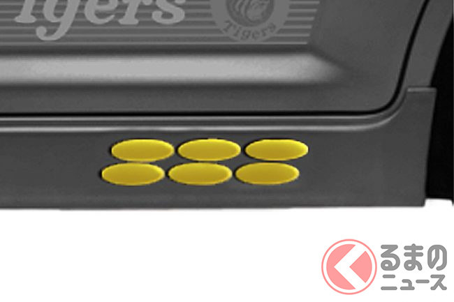 ボディ側面下部には「HANSHIN Tigers」のロゴと円形の球団マークをあしらったロゴストライプを装備し、テールゲートにも球団マークを装着しています。