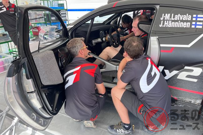 今回デモランを行なった2台のWRCマシンはトヨタ自動車が所有するテストカーですが、「GRヤリス・Rally 1」は実戦を戦うマシンと同様のアップデートが行なわれていますが、その作業もトヨタ社員の手で行なわれています。