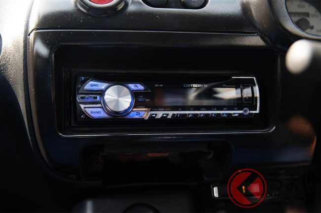 出展車両の装備品としては、14インチのRAYSホイールやMOMO社製ステアリングホイール、それにRAZOペダル、カロッツェリアCDプレーヤーなどを装備。
