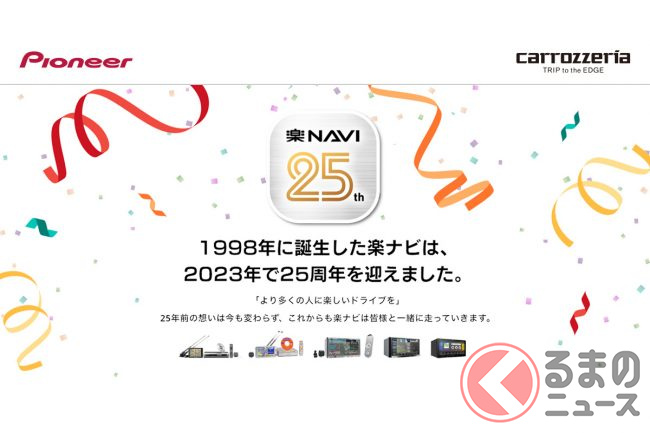 パイオニアは2023年9月22日、「楽ナビ」シリーズが今年で発売25周年を迎え、累計出荷台数が650万台を突破したと発表しました。10月上旬には楽ナビ誕生25周年を記念したイベントを開催予定です。