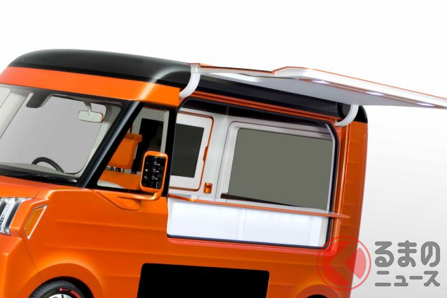 エクステリアは鮮烈なオレンジ色とブラックのルーフが特徴で、スーパー軽ハイトワゴン「タント」とも共通性を感じさせるデザインですが、左側には乗降用のドアはありません。
