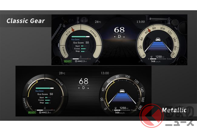 今回のソフトウェアアップグレードでは、既定の4種類に加えて、新たな独自のメーターデザインとなる「Classic Gear」と「Metallic」の2種類を追加。
