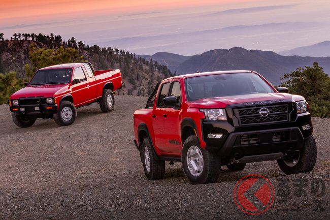日産の米国法人はピックアップトラックの新型「フロンティア」2024年モデルに、D21型「ダットサントラック」をオマージュした限定仕様を設定しました。同マスクの初代「テラノ」をほうふつとさせる雰囲気に、往年のファンたちから多くの反響が寄せられています。