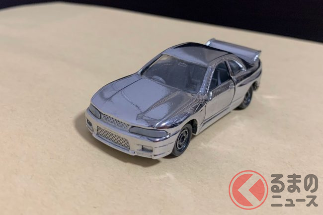 写真には、光る銀メッキが印象的なイベント限定非売品とされる日産「スカイライン GT-R(BCNR33型・以下R33 GT-R)」のミニカー「トミカ」と、りょうさんの現在の愛車、レッドボディにNISMOのホイールを履くR33 GT-Rが収められています。