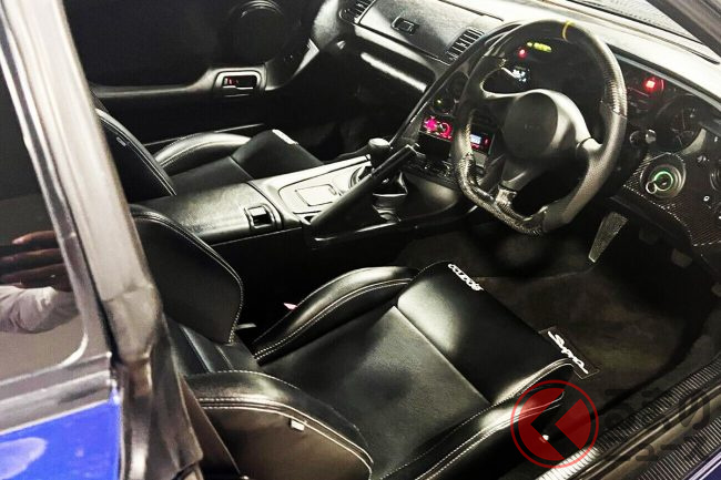 内装は比較的落ち着いているようにも見えますが、ステアリングやダッシュボードはカーボン素材のものへと置き換えられ、また、シートもスパルコ製レーシングシートへと交換されています。