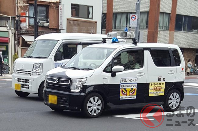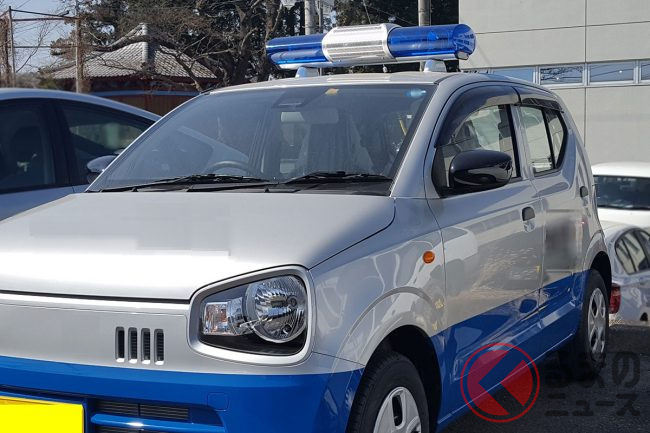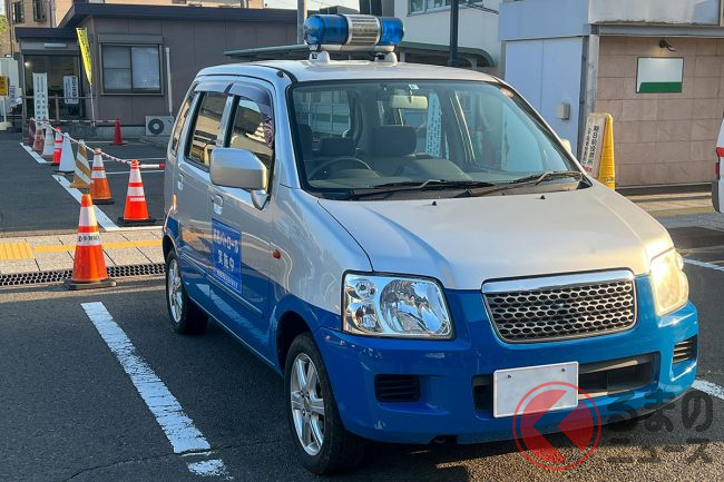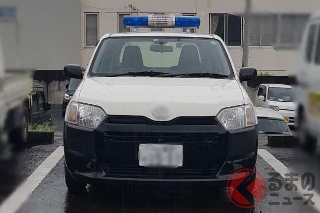 まるで「白黒パトカー」!? 青い回転灯のせた「謎のクルマ」正体は? 街を走り回ってる意外な理由とは?