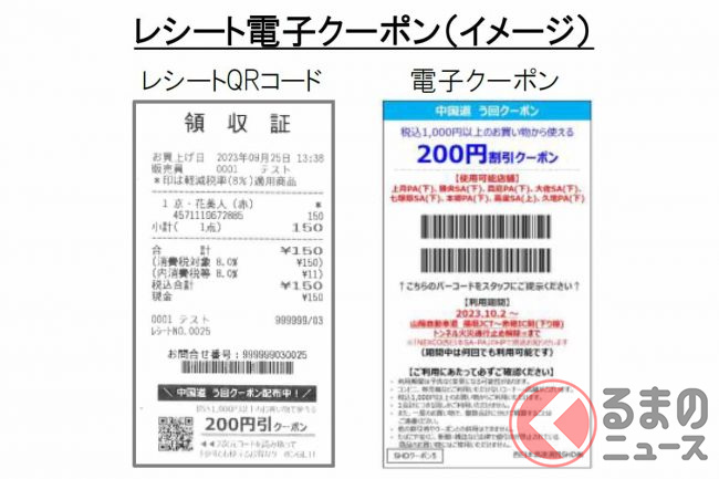 関西地区の対象SA・PAで買い物した人にQRコード付きのレシートを発行。客はQRコードを読み込むと、200円分の割引電子クーポンを獲得できます。