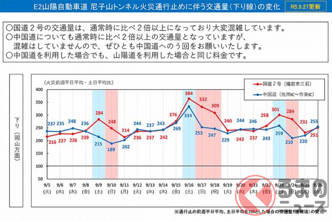 山陽道下り(岡山方面)の一部区間でトンネル火災による通行止めが続いていることから、NEXCO西日本は2023年9月27日、中国道への広域迂回をさらに促すため、ポイントとクーポンを使った施策を新たに始めると発表しました。