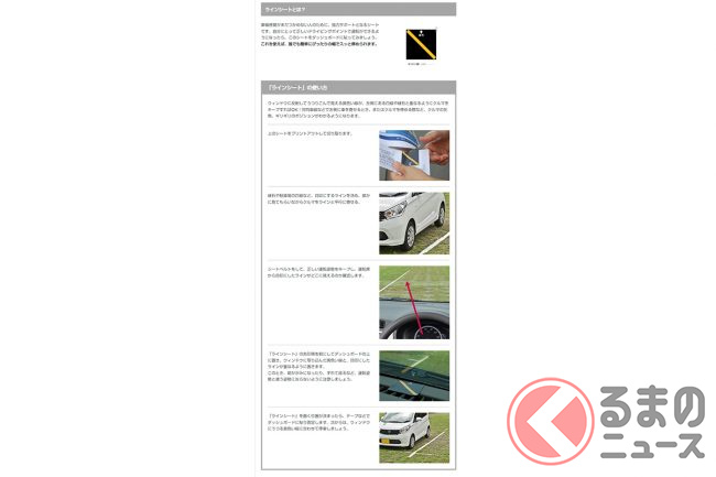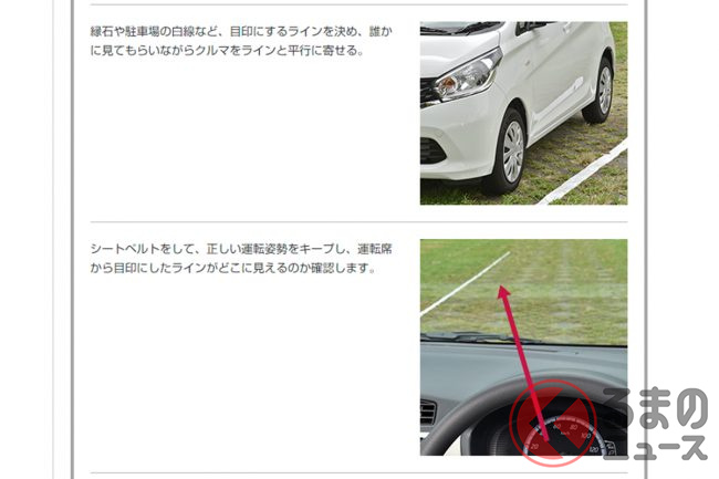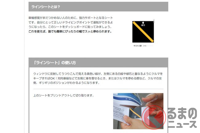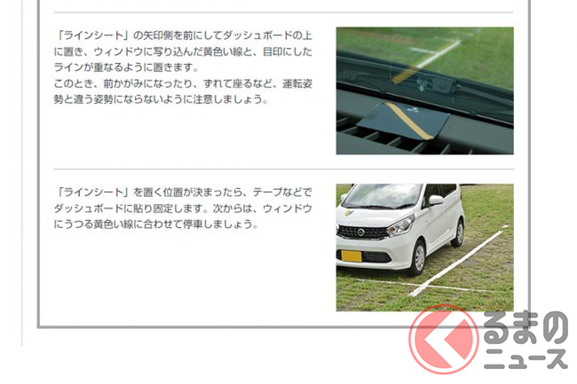 この目印と目印越しに見た車線との間隔を一定に保って走れば、車線内でのふらつきを抑止でき、安全運転につながる……という理屈です。