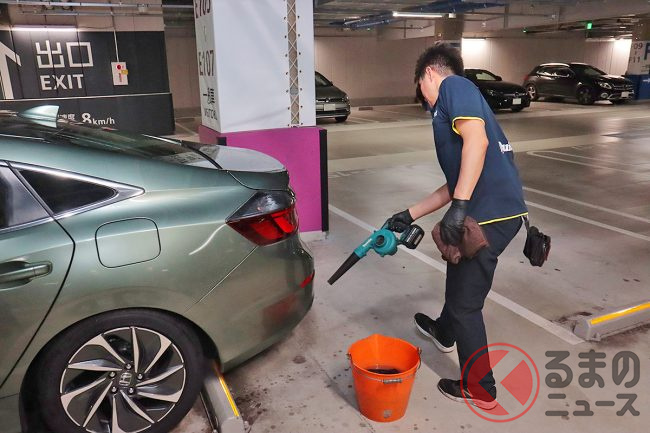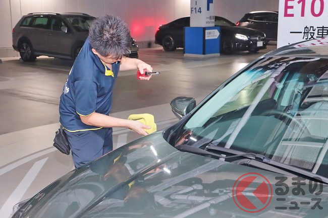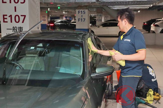 そしてもうひとつのメリットが、洗車のためにクルマを移動させたり、車両のキーを預けたりすることも不要という点。スタッフが洗車用具を積んだカートで移動し、車両を止めたその場が洗車スペースとなるため、いちいちクルマを移動させることも、キーを預ける必要もないというワケなのです(車内清掃を実施する場合はキーの預かりが必要)。