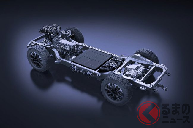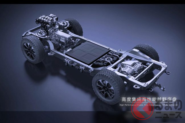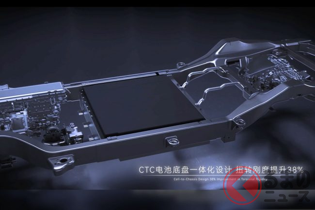 ハイブリッドシステム搭載に向けて最適化したラダーフレームに刀状のセルを特徴とする自社開発の「ブレードバッテリー」がセル・トゥ・シャシー(CTC)方式で埋め込まれています。